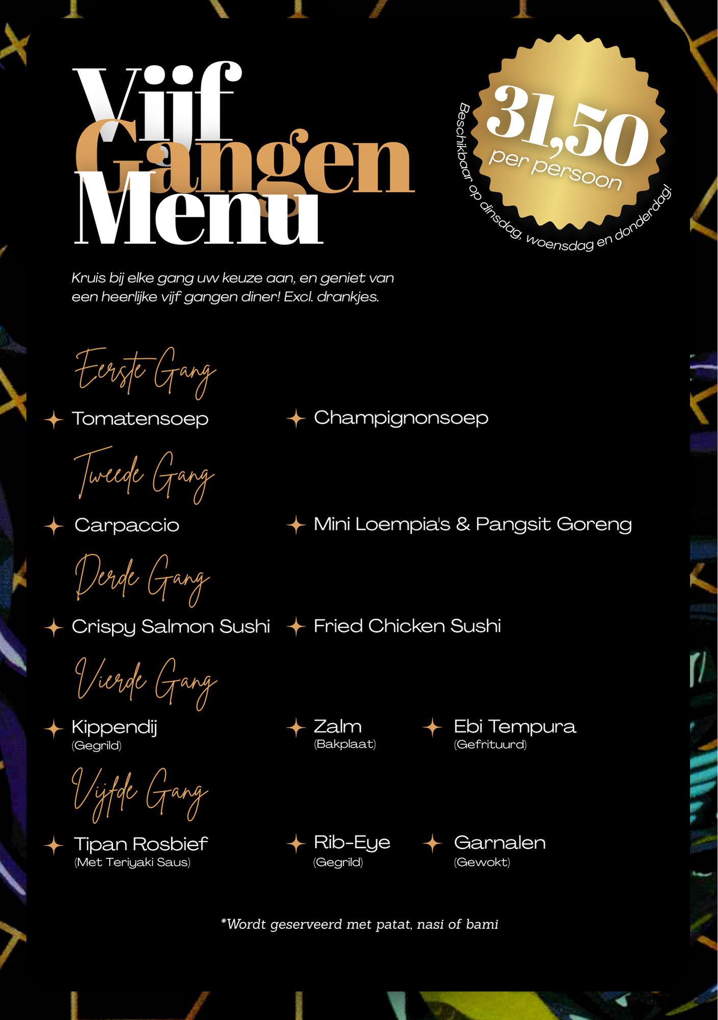 Exclusief op dinsdag, woensdag en donderdag serveren wij ons 5-gangenmenu. Een cullinaire reis waar traditie en innovatie samenkomen, door verborgen smaken en combinaties waar Oost en West samenkomen.